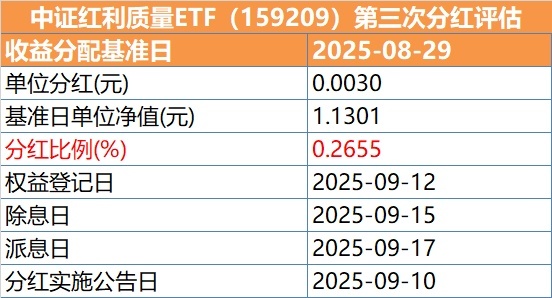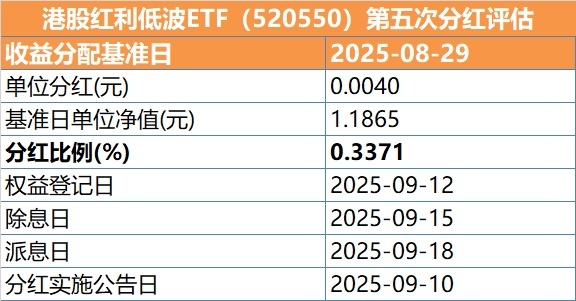 港股红利低波ETF(520550)则迎来本年度第5次分红评估,分红比例为0.34%。根据公告,两只产品权益登记日均为9月12日。